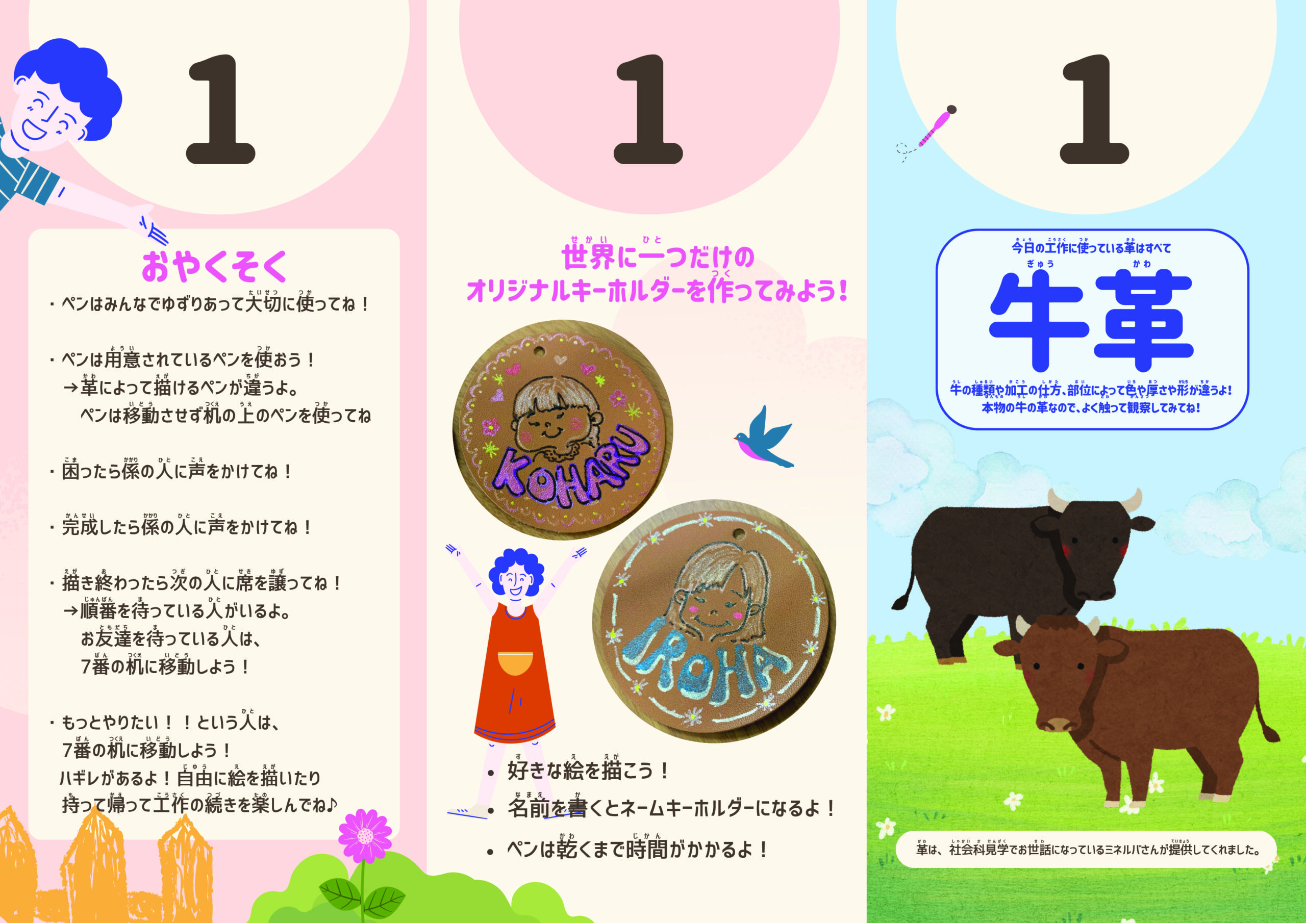 実際の様子として、革素材に描かれたカラフルなキーホルダーや、お子さまたちが楽しそうに制作する姿を写真でもご紹介しています。