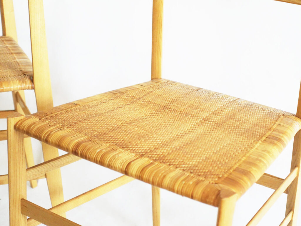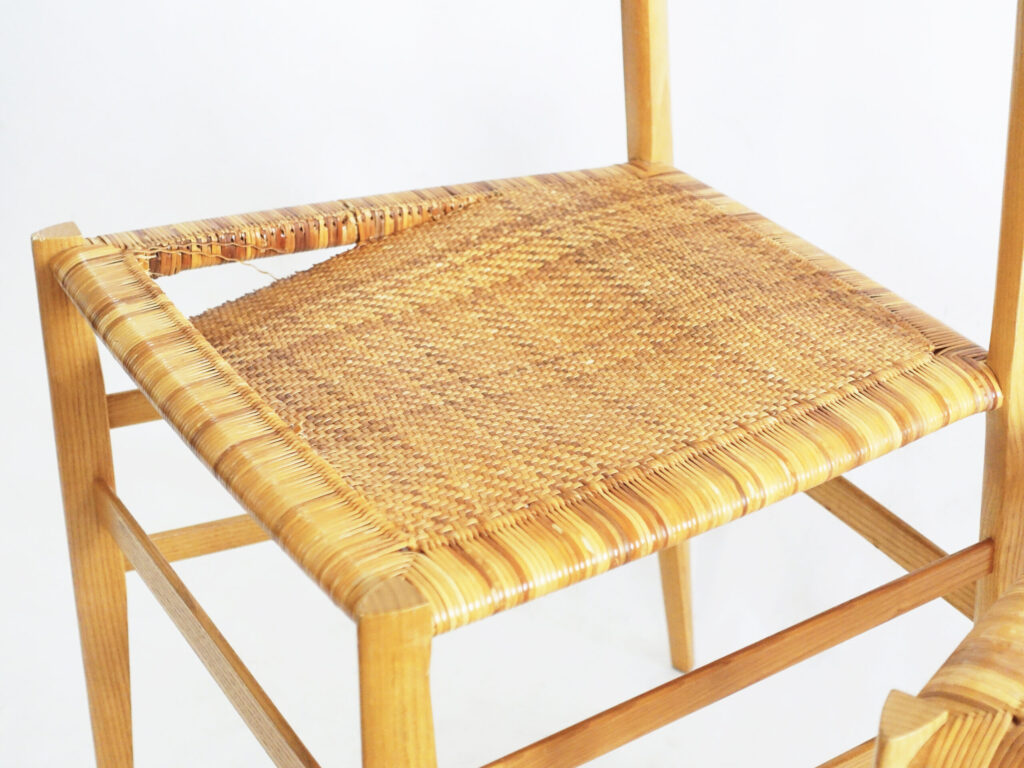 Cassina カッシーナ 699 スーパーレジェーラ 籐張の張替え 2025年6月 個人邸 椅子 - About -はじめに Cassina カッシーナ 699 スーパーレジェーラ 籐張の張替えのご依頼を頂きました。 Before カッシーナの名作「スーパーレジェーラ」。その座面を支える籐は、繊細で軽やかな素材ゆえに、年月とともに摩耗やたるみが目立つようになっていました。長年の使用で編み目は緩み、小さなほつれも散見され、座ったときの安心感が薄れてしまっていました。名作ゆえの美しいフォルムは保たれているものの、座面の傷みが椅子全体の印象を曇らせていたのです。 製作フロー 修復は、一本一本の繊維を傷つけないように丁寧に外し、フレーム部分に歪みや緩みがないかを点検。その後、新たな籐素材を選び、適切な湿度を含ませながら張力を調整しつつ編み込んでいきます。 この編み込み作業は、単なる再現ではなく、座面全体に均一な強度と美しさを宿す繊細な工程。編み目が整ったあとには、表面の仕上げと保護処理を施し、座り心地と耐久性を高めていきます。 After 張り替えられた座面は、かつてのような凛とした緊張感を取り戻しました。籐ならではの透け感と清涼感が映え、座ったときにはしなやかな弾力が心地よく体を支えます。フレームの軽快なデザインと、新しい籐座面が見事に調和し、椅子本来の軽やかな美しさが蘇りました。 ミネルバの“メイドイン東京”のものづくりは、東京・品川区の工房で行われています。 厚生労働大臣認定の国家資格を持つモデラーやクラフトマンが「想いを形に」していきます。 仕上がりの魅力 この再生は「ただ元に戻す」ことではありません。 ・均整のとれた編み目がもたらす端正な表情 ・新しい座り心地が与える安心感と清涼感 ・名作家具にふさわしい気品を再び宿した佇まい 長い時を共に過ごしてきた椅子は、再び暮らしの中で活躍できる存在へと生まれ変わりました。 一覧へ戻る
