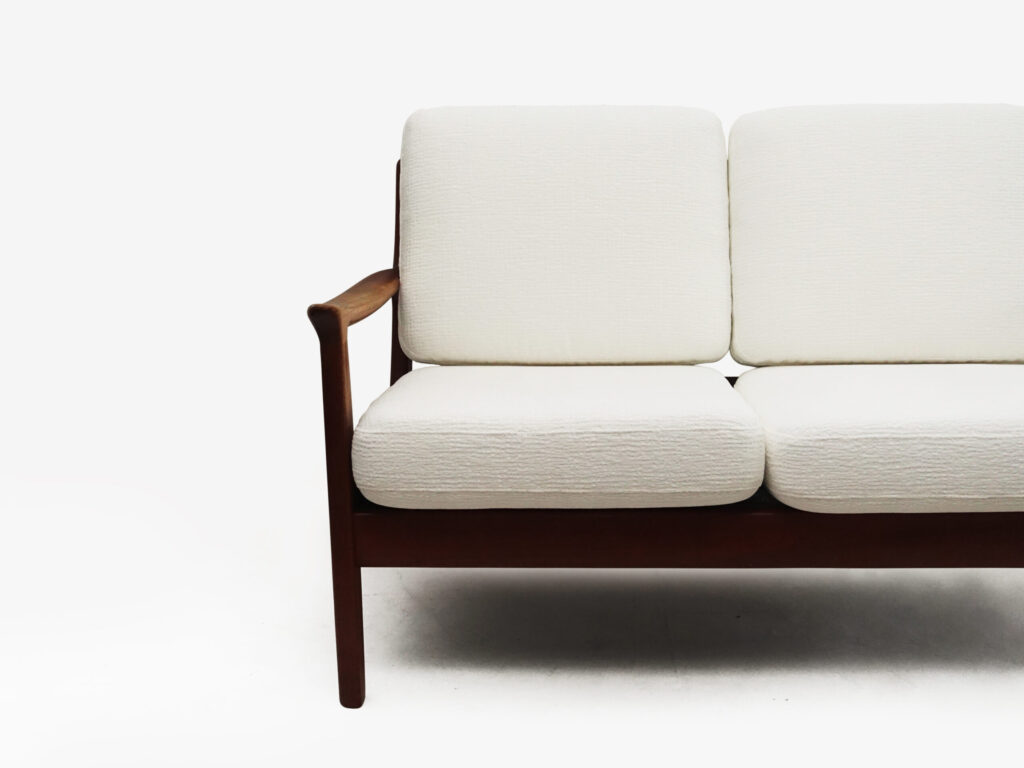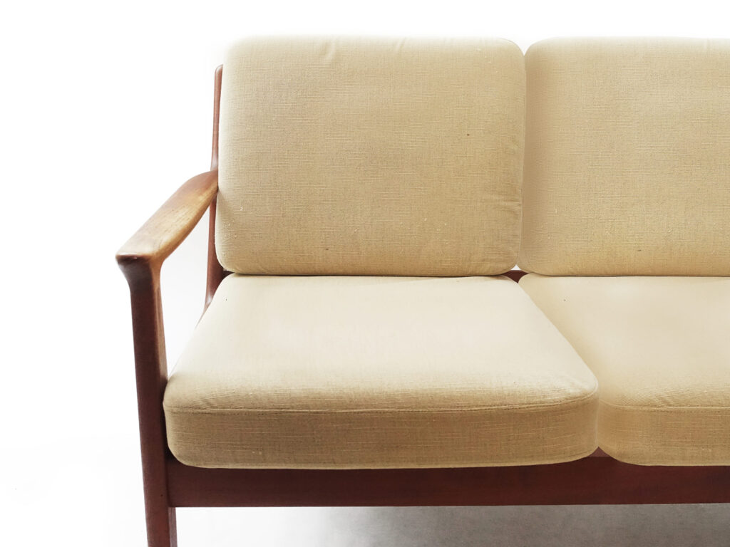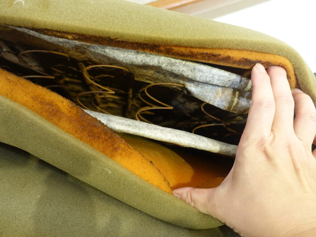 内部構造についてもご相談がありました。背と座にはバネを用いた仕様でしたが、バネが相当錆びていたため、「バネを使わずにウレタン仕様へ変更できないか」というご要望をいただきました。当初は補充でのご案内をしていましたが、最終的には全面的にウレタンへと交換する仕様へと改良いたしました。バネを使わないことで座り心地は大きく変わるため、本体フレームを工房でお預かりし、職人が状態を見極めながら作業を進めます。