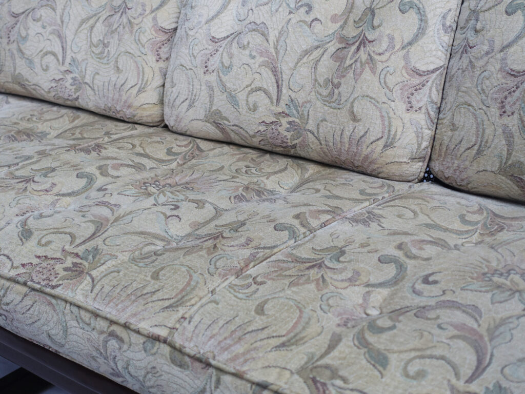 再生されたソファは、上質な生地で張り替えられ、座り心地も向上。風通組織でふっくらとしたレトロな印象の花柄が施され、色味も現状に近いものとなり、リビング全体が一層華やかに、そして落ち着いた雰囲気となりました。