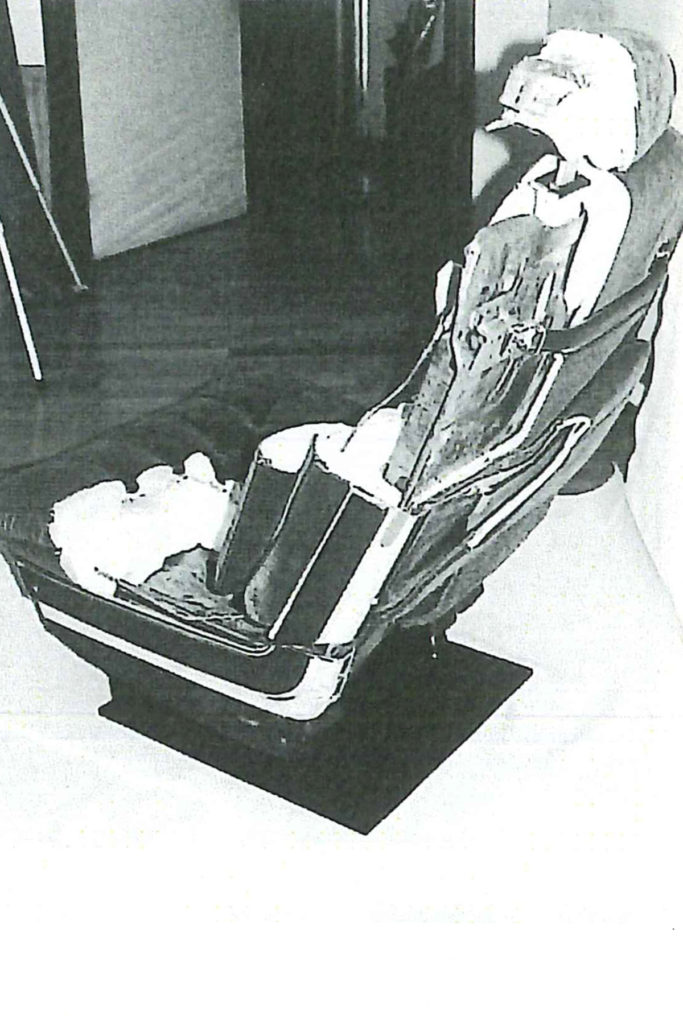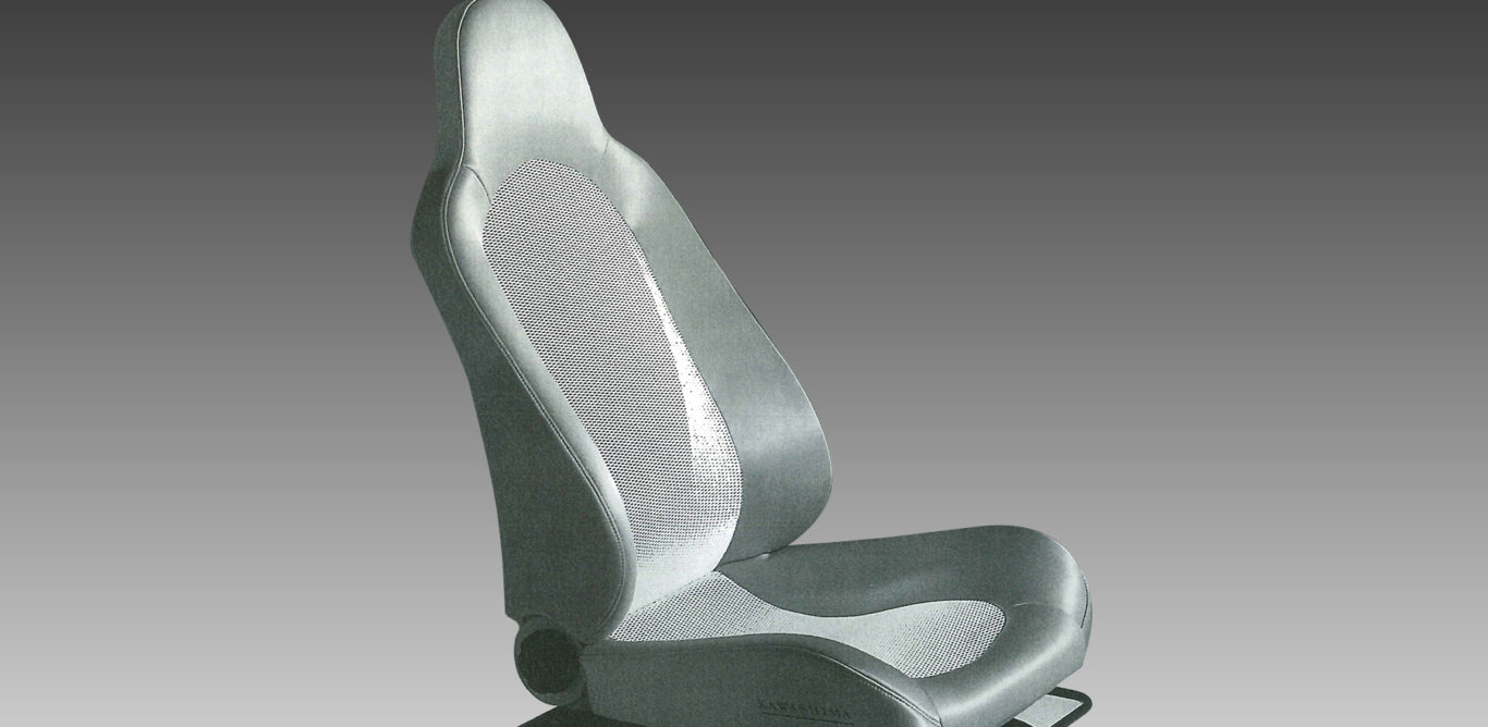 慶応義塾大学の清水浩教授が取組む、電気自動車「エリカ」のシート。川島織物からの依頼で、昨年、開発に携わった。メッシュの張地である。