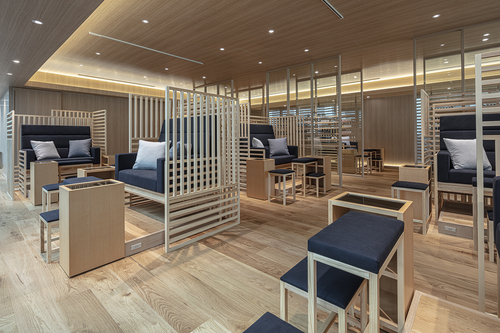今回手がけたのは、施術用のソファ9台をはじめ、スタッフ用のスツール、施術ワゴン、そして待合室に設置するアーム付きのラウンジソファまで、多岐にわたる家具一式。特に空間の印象を大きく左右するパーテーションやソファの意匠設計では、「25mm角のスチールバーを組み合わせる」というデザインコンセプトに基づき、構造と美しさの両立にこだわりました。
